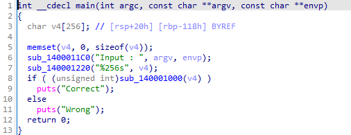 main 함수이다. 이 전 문제들과 동일한 형태이다. 바로 sub_140001000 함수로 들어가보자.