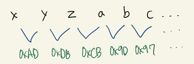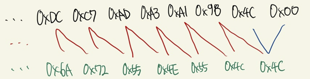 이 값을 반대로 생각해서 원래의 입력 값인 x, y, z, a, b, c 등을 알아내야 한다. 문제에서는 for문으로 i가 0부터 23까지 총 24번을 반복한다. 이 문제에서의 핵심 키는 마지막 23번 인덱스의 값이 0x00이라는 것이다. 즉, byte[22] = input[22] + input[23]에서 input[23] = 0x00 이므로, input[22]는 위에서 확인함과 같은 0x4c가 된다.
