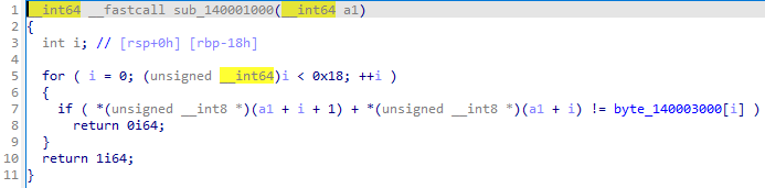 if ( *(unsigned __int8 *)(a1 + i + 1) + *(unsigned __int8 *)(a1 + i) != byte_140003000[i] )뭔가 복잡하게 길어보이지만, 보기 쉽게 바꾸면 다음과 같다.
