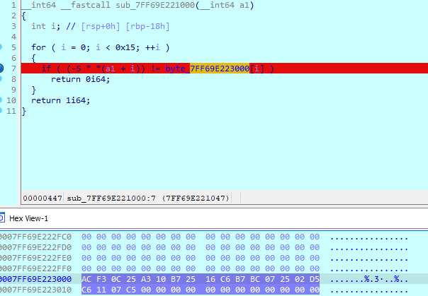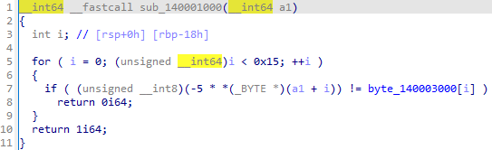 if ( (unsigned __int8)(-5 * *(_BYTE *)(a1 + i)) != byte_140003000[i] )마이너스를 곱해주는 연산이다. -5의 자료형이 unsigned int 자료형이므로, 0xfb로 사용된다.