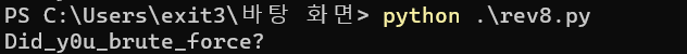 if 조건문의 어셈블리어이다. imul명령어로 0xfb를 곱해준다. 그리고 1byte만 사용할 수 있도록 0xff를 and연산한다. 이 흐름을 그대로 구현하여, ascii 문자값을 모두 브루트포싱하여 식에 맞는 값을 저장하고 출력한다.