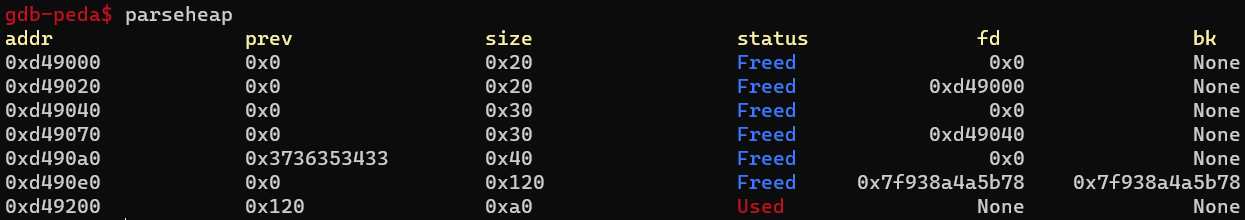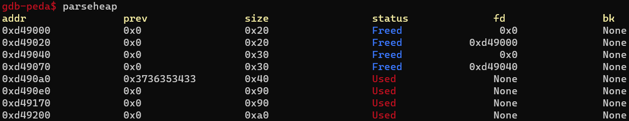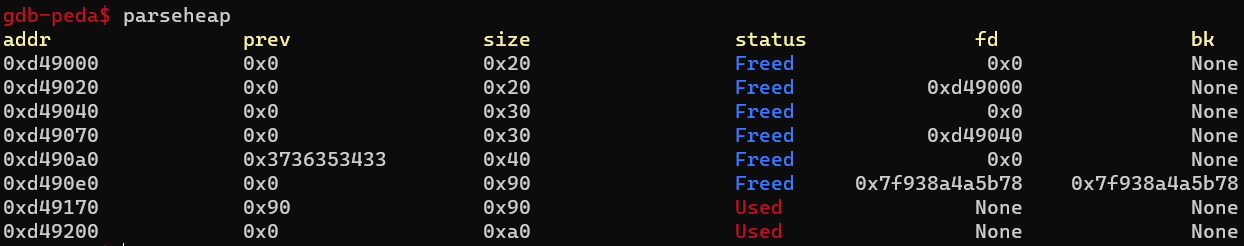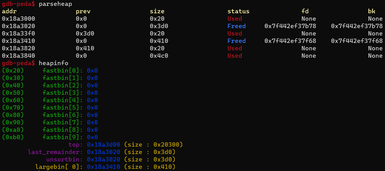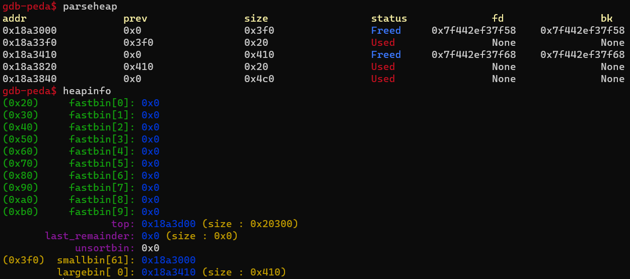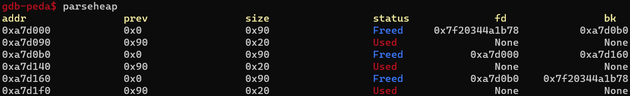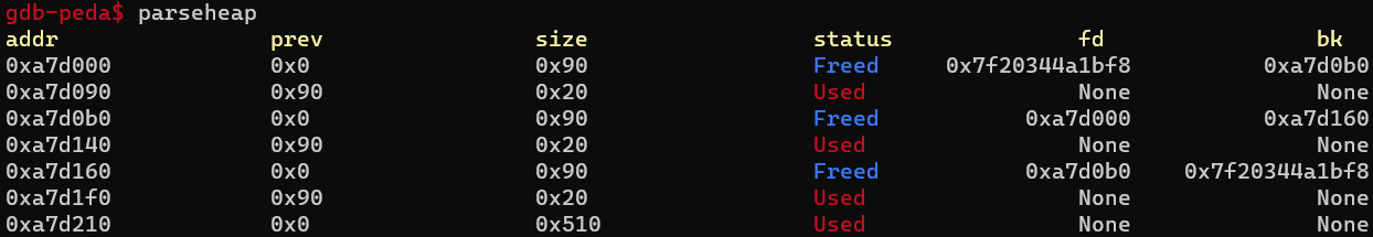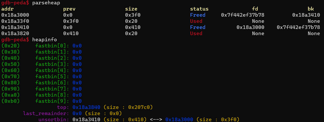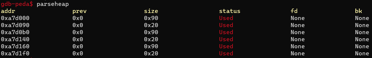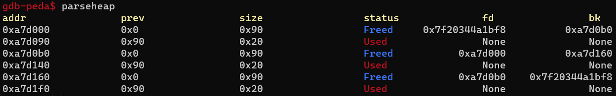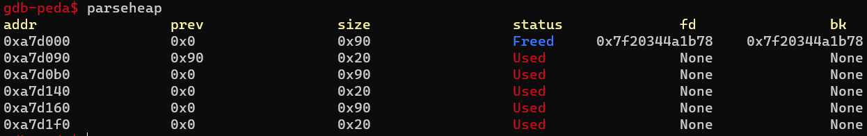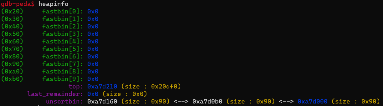 chunk5๋ malloc(0x80)์ ํ๋ค. ํค๋ ์ ๋ณด์ ํฌ๊ธฐ์ธ 0x10์ ๋ํ๋ฉด 0x90์ ํฌ๊ธฐ๋ฅผ ๊ฐ์ง๋ค. 0x90์ 144byte์ด๊ณ , 64bit ๊ธฐ์ค์ผ๋ก 32~128byte๋ฅผ fastbin์ผ๋ก ๊ด๋ฆฌํ๋ค๊ณ ํ์ผ๋ฏ๋ก, fastbin์ ๋ค์ด๊ฐ์ง ์๋๋ค. heapinfo ์ size๊ฐ 0์ด์๋ unsorted bin์ด 0x90์ผ๋ก ๋ฐ๋ ๊ฒ์ ํ์ธํ ์ ์๊ณ , ํด์ ๋ chunk์ ์ฃผ์ ๊ฐ์ด ์จ์ ธ ์๋ค. ๋ํ parseheap์ผ๋ก ํด๋น ์ฒญํฌ์ fd์ bk๊ฐ ์ด๋ ํ ํน์ ์ฃผ์ ๊ฐ์ผ๋ก ๋์ผํ๊ฒ ๋ค์ด๊ฐ ๊ฒ๋ ๋ณผ ์ ์๋ค.