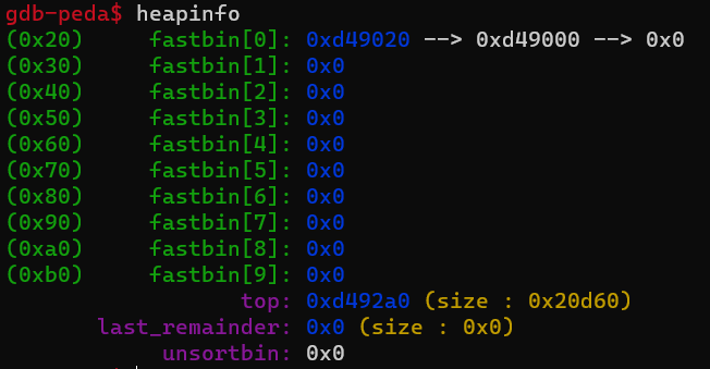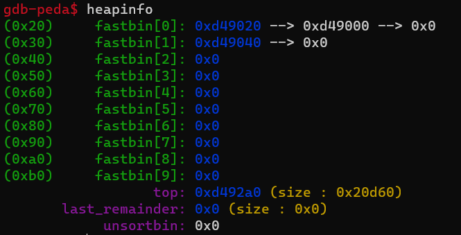 chunk1์ malloc(0x10)์ด์๋ค. ํ์ง๋ง chunk์ ์ค์ ํฌ๊ธฐ๋ data๋ฅผ ๋ด๋ ์์ญ(0x10)๊ณผ ํค๋(0x10)๊ฐ ํฉ์ณ์ ธ์ 0x20ํฌ๊ธฐ๊ฐ ๊ตฌ์ฑ๋๋ค. ๊ธฐ๋ณธ ๊ตฌ์ฑ์ ๊ฐ์ถ๊ธฐ ์ํด 0x20 ํฌ๊ธฐ๋งํผ ํ ๋น๋ chunk0๊ณผ ๊ฐ์ ํฌ๊ธฐ๋ฅผ ํ ๋น๋ฐ๊ฒ ๋๊ณ , ํด์ ์์ 0x20 ํฌ๊ธฐ๋ฅผ ๋ด๋ fastbin[0]์ ๋ค์ด๊ฐ๋ค. ์ด๋ fastbin์ LIFO(ํ์ ์ ์ถ) ๊ตฌ์กฐ๋ฅผ ๊ฐ์ง๊ธฐ ๋๋ฌธ์ ๋์ค์ ๋ค์ด๊ฐ chunk1(d49020)์ด ์ฌํ ๋น ํ์ ์ ๋จผ์ ํ ๋น๋๋ค. ์ ์ฌ์ง์์๋ chunk1(d49020)์ fd ๊ฐ์ chunk0(0xd49000)์ผ๋ก fd๋ฅผ ํตํด ์ฐ๊ฒฐ๋์ด ๊ด๋ฆฌํ๋ ๊ฒ์ ํ์ธํ ์ ์๋ค.