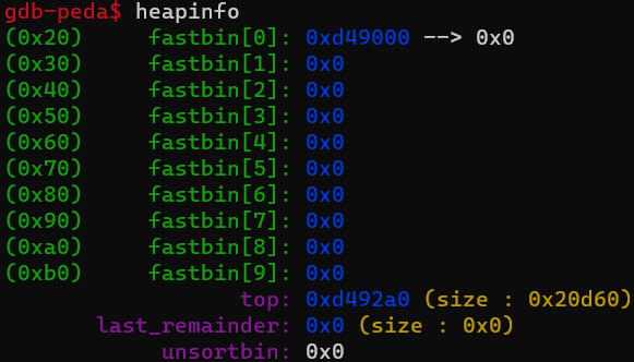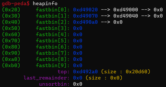 }fastbin์ด ๊ด๋ฆฌํ๋ chunk์ ํฌ๊ธฐ๋ 32bit ์ด์์ฒด์ ์์๋ 16~88byte(10๊ฐ์ bin)์ด๊ณ , 64bit ์ด์์ฒด์ ์์๋ 32~128byte(7๊ฐ์ bin๋ง ์ฌ์ฉ)์ด๋ค. 64bit ๊ธฐ์ค์ผ๋ก fastbin์ ์ํ๋ ์ฌ๋ฌ ์ฌ์ด์ฆ์ ์ฒญํฌ๋ฅผ ํ ๋นํ๊ณ ํด์ ํ๋ฉด์ ๋ฉ๋ชจ๋ฆฌ๋ฅผ ํ์ธํด๋ณด์.