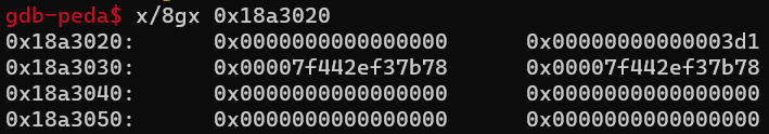 ์์ธํ ํ์ธํด๋ณด๋ฉด 0x20๋งํผ fastbin์ผ๋ก ๋ถ๋ฆฌํ๊ณ , 0x18a3020๋ถํฐ ๋ค์ chunk๋ฅผ ๊ตฌ์ฑํ๋ค. ์ด๋ ์ ์ฒญํฌ๊ฐ ์ฌ์ฉ์ค์ด๋ฏ๋ก, sizeํ๋์ PREV_INUSE ํ๋๊ทธ๊ฐ true๊ฐ ๋๋ค.