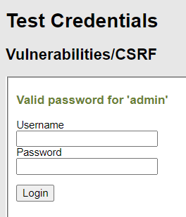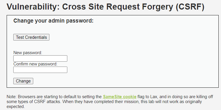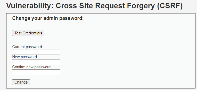CSRF 탭에는 패스워드를 변경하는 폼이 작성되어 있다. 그리고 Test Credentials로 계정의 비밀번호가 맞는지 확인할 수 있다. CSRF 공격을 통해 일반 사용자가 원치 않게 비밀번호가 수정되는 것을 실습한다.