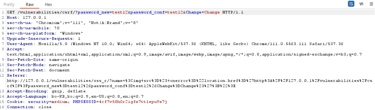 해당 HTML 코드는 이렇게 나타난다. 이제 이 버튼을 클릭하면 Reflected XSS 탭의 취약점을 발생시키고, 이때 img 태그의 onerror에 CSRF 탭에 공격 구문을 삽입하면 된다. 그러면 referer는 http://127.0.0.1/vulnerabilities/xss_r 이 들어가면서 referer 검증을 우회할 수 있다.