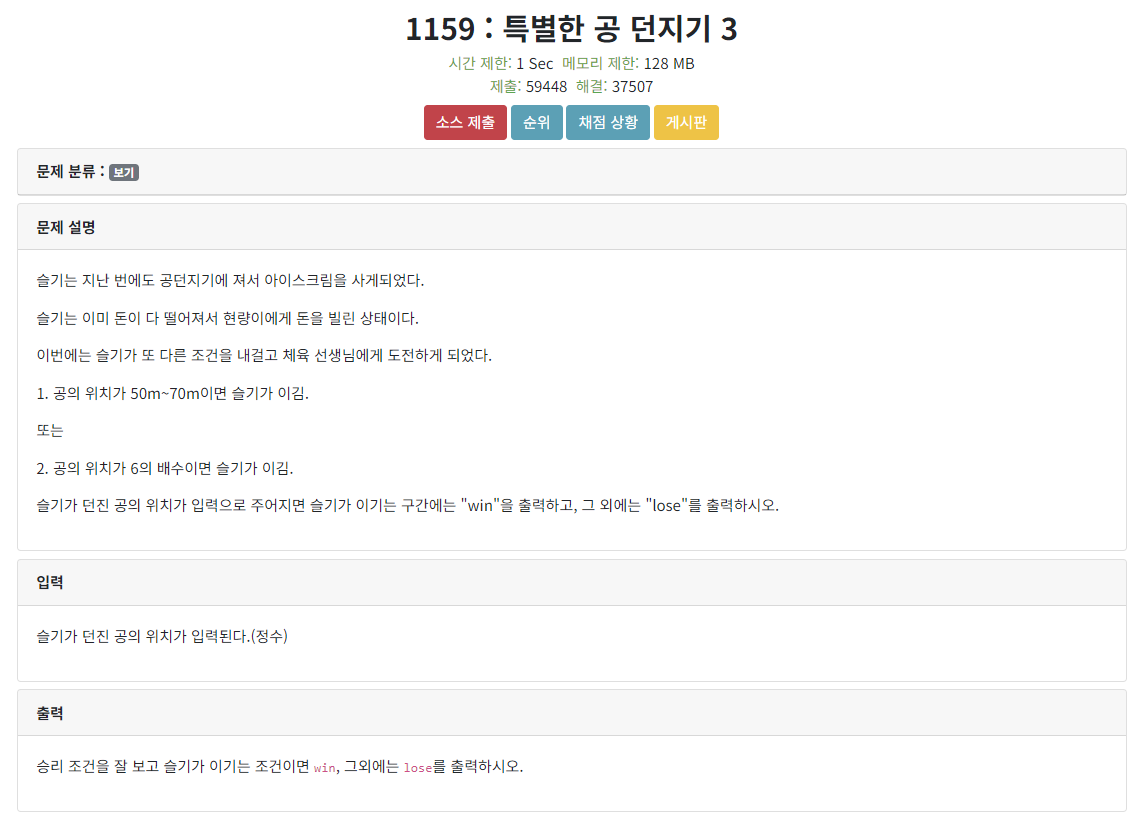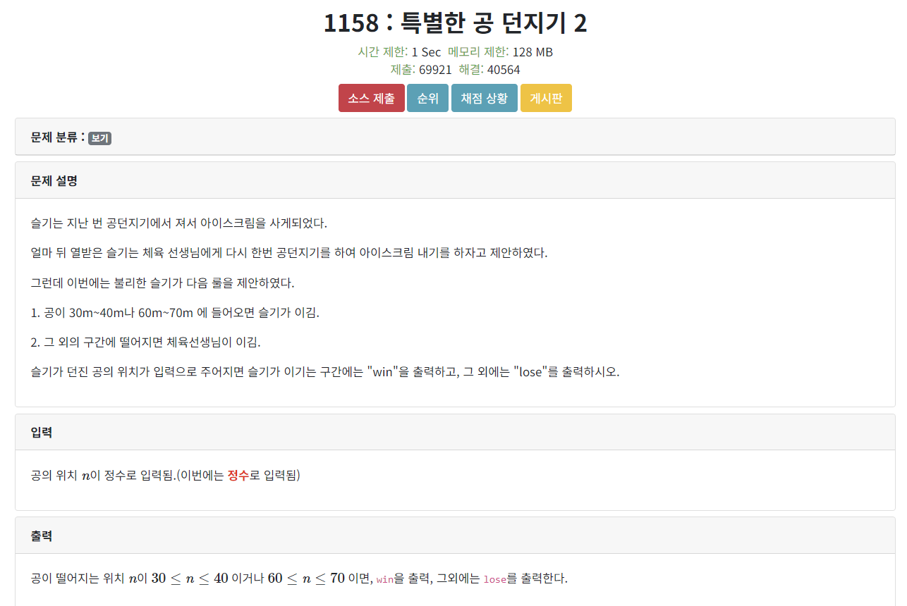 공이 떨어지는 위치 $n$이 $30 \leq n \leq 40$ 이거나 $60 \leq n \leq 70$ 이면, win을 출력, 그외에는 lose를 출력한다.
