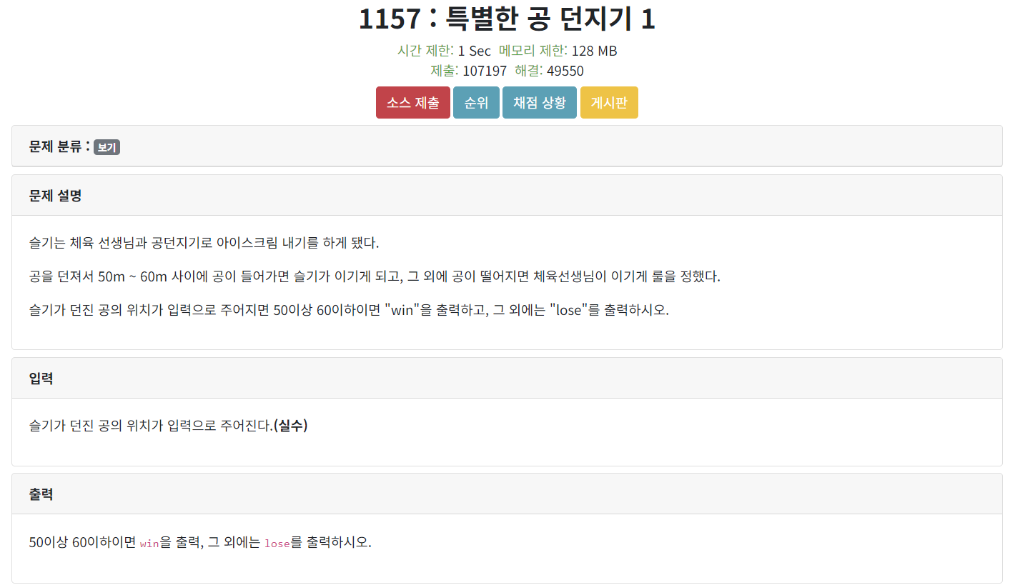 50이상 60이하이면 win을 출력, 그 외에는 lose를 출력하시오.