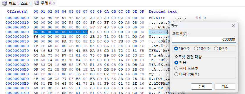 6291456 섹터로 가면 FILE0 시그니처가 보인다. 0xC0000000부터 MFT 시작 주소임을 알 수 있다.