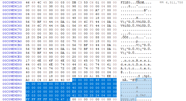 5) HxD 도구로 nonResidentDataAttr.txt 파일의 실제 데이터 시작 섹터 및 섹터 크기 확인