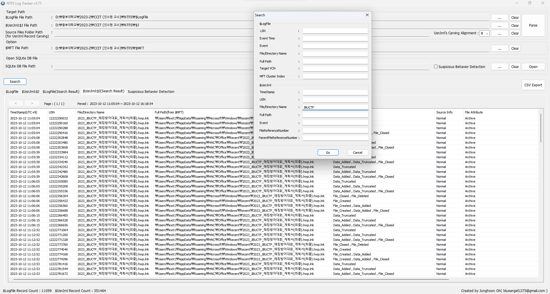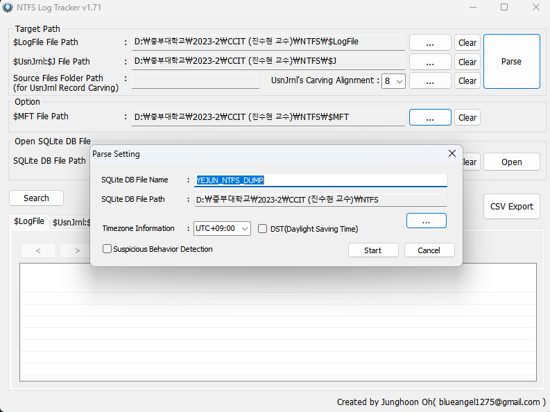 추출한 $MFT, $LogFile, $UsnJrnl→$J 파일의 Path를 넣고, Parse 버튼을 눌러 데이터를 파싱한다.