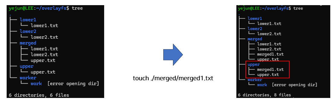 merged 디렉터리에 새로운 파일이 생성되면, 이는 upper 디렉터리에 COW 하는 것을 확인할 수 있다.
