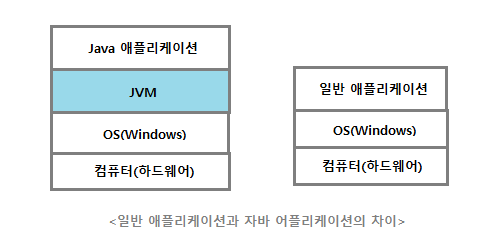 - 자바는 자바가상머신(JVM)의 위에서 작동하기 때문에 운영체제와 관계없이 실행이 가능하다. (C언어인 경우 운영체제마다 코드를 조금씩 수정해야 함)