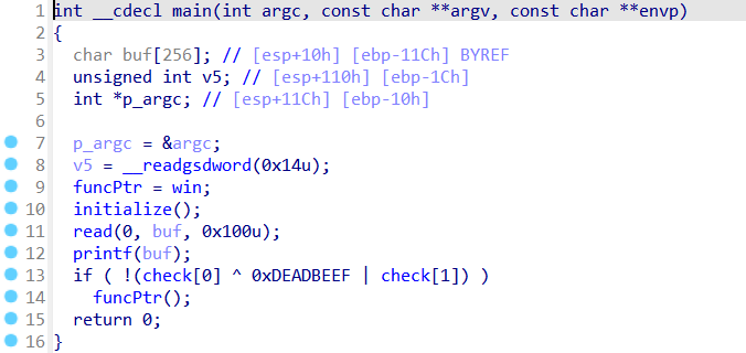 funcPtrํฌ์ธํฐ์ winํจ์ ์ฃผ์๋ฅผ ์ ์ฅํ๊ณ , check์ ์ญ๋ณ์์ ๊ฐ์ด 0xdeadbeef์ด๋ฉด funcPtr์ ๋ค์ด๊ฐ ํจ์๋ฅผ ํธ์ถํ๋ค.